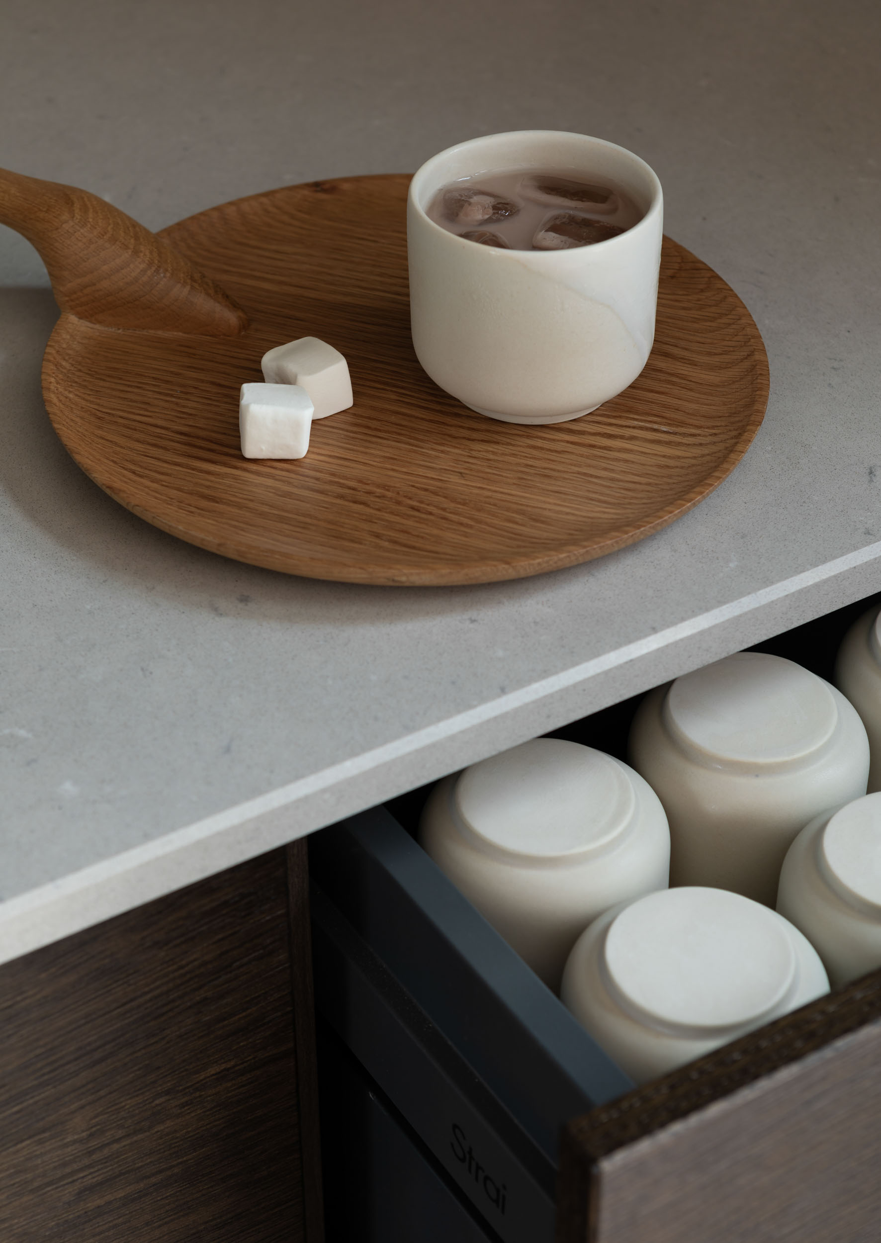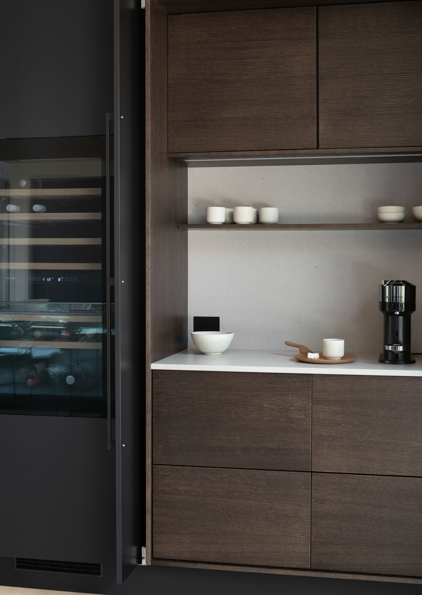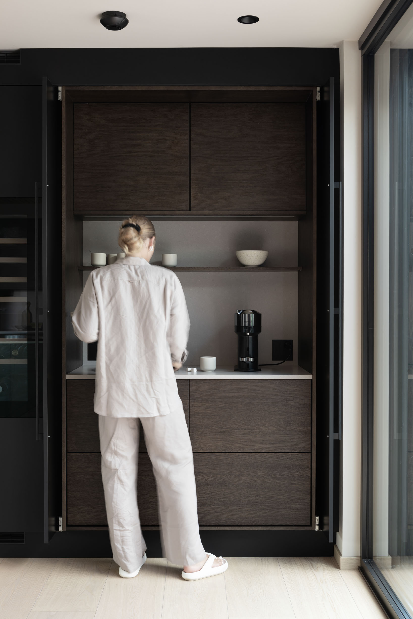 Ved å holde pocketdørene åpne får du både det praktiske og det estetiske uttrykket frem. Dørene blir skult inn i «lommene» i skapet og benkeplaten og den lekre innredningen kommer frem. Her kan du vise frem interiørfavorittene dine og lage en hyggelig kaffestasjon, bakeavdeling eller en liten barløsning – her er det bare å være kreativ og skape ditt eget personlige uttrykk.