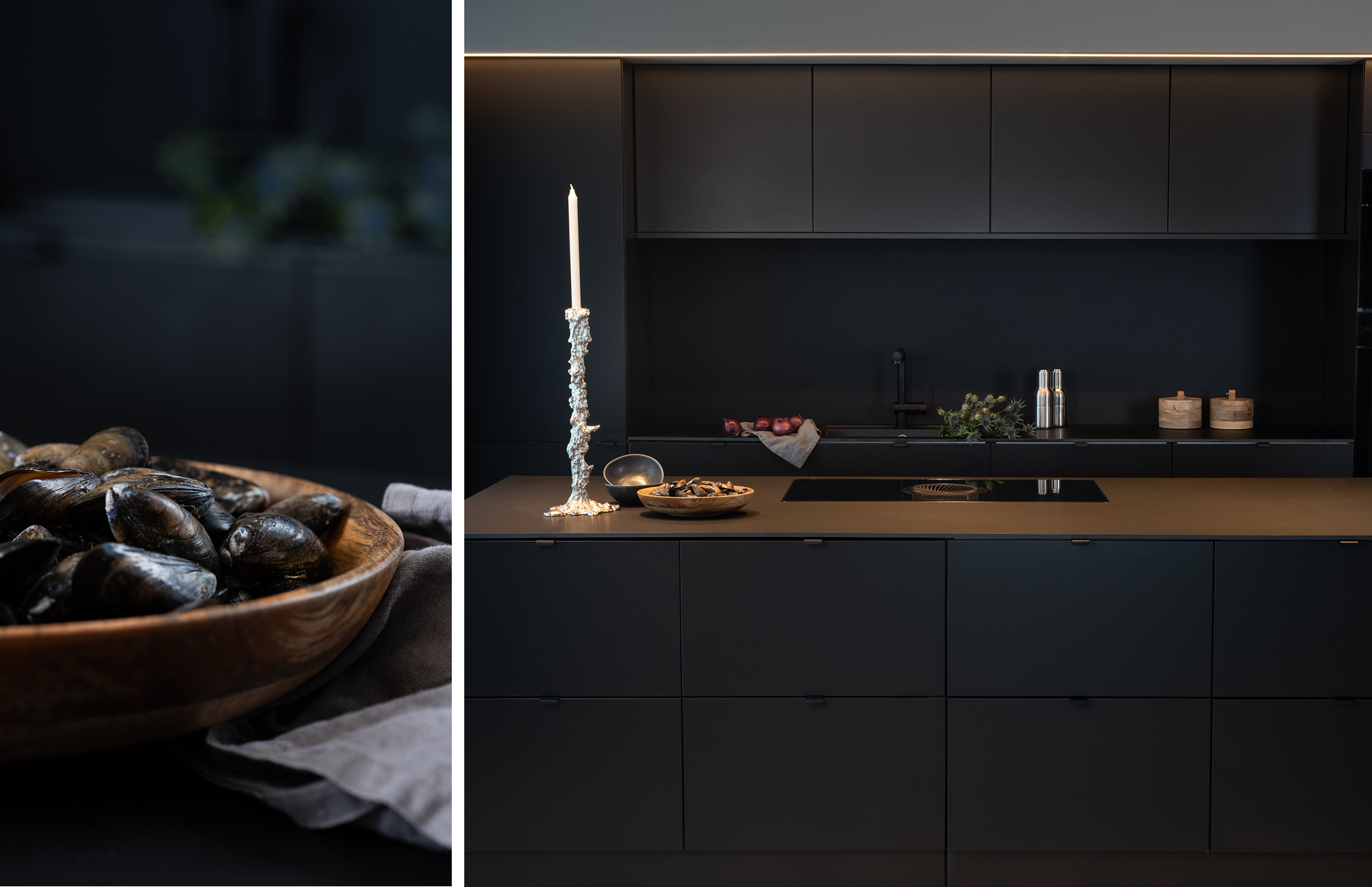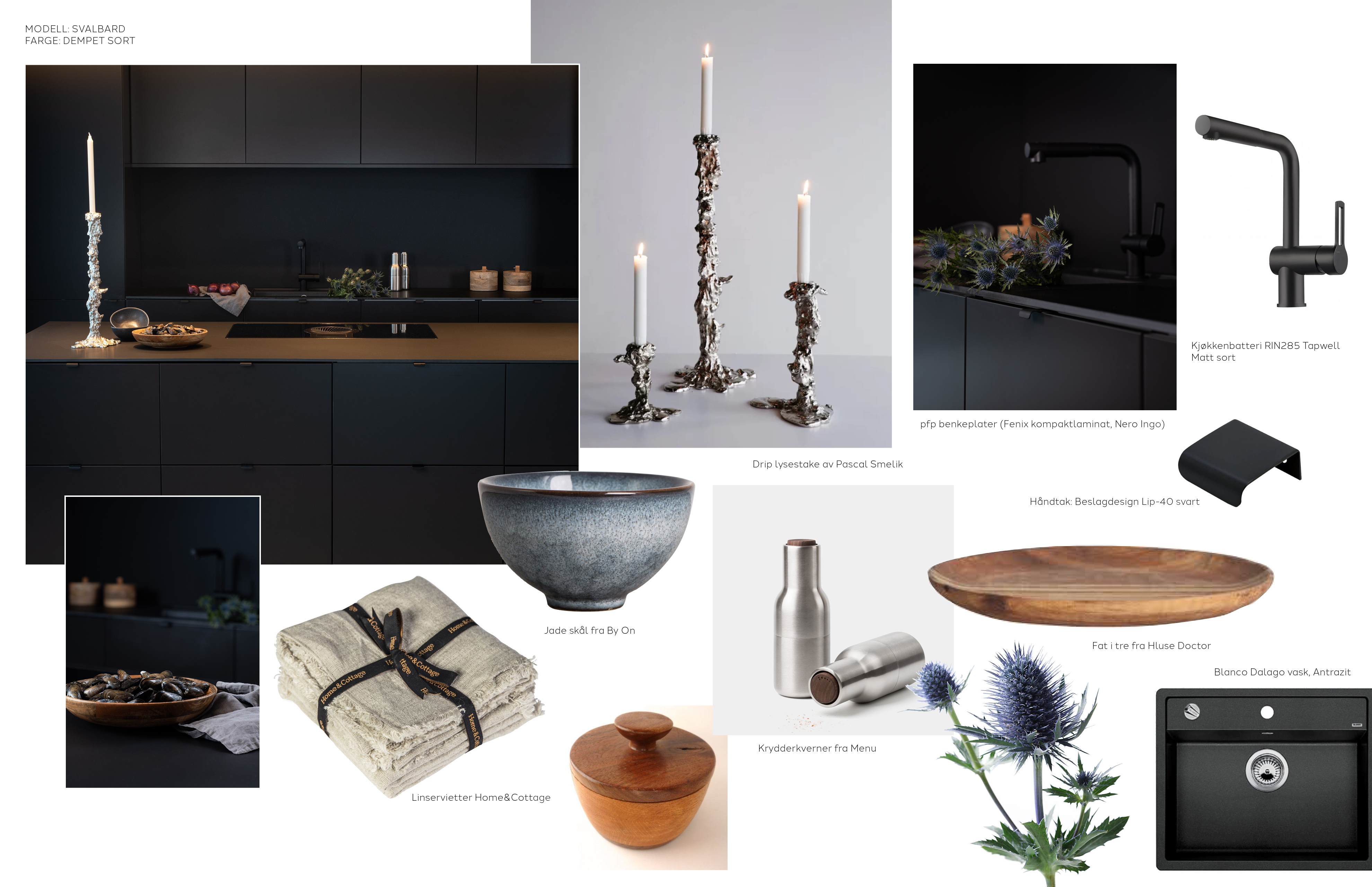 Matt sort blandebatteri på matt sort kjøkken. Dette er kjøkkenet for den stilbevisste med øye for detaljer. Dekorer med statementgjenstander som underbygger det rene i kjøkkeninnredningen. Ikke vær redd for å overraske!
