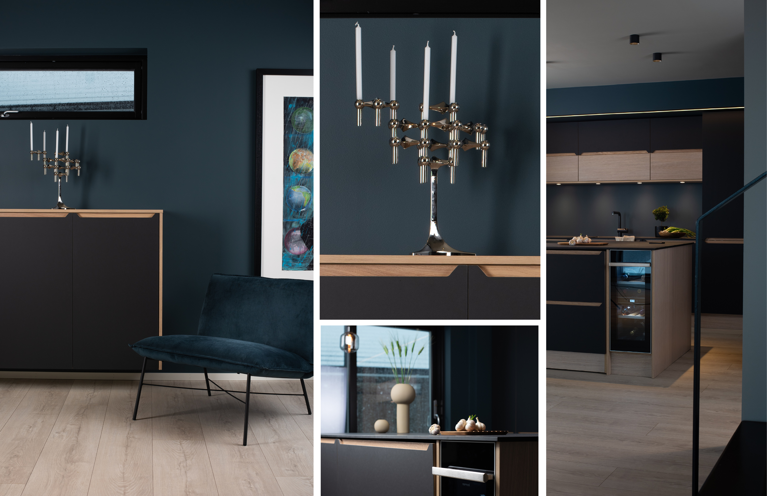 Heltre og eksklusive detaljer. Dette kjøkkenet tåler store objekter og står godt mot edle metaller. Hvorfor ikke la avtrekksvifta få være et smykke i rommet?