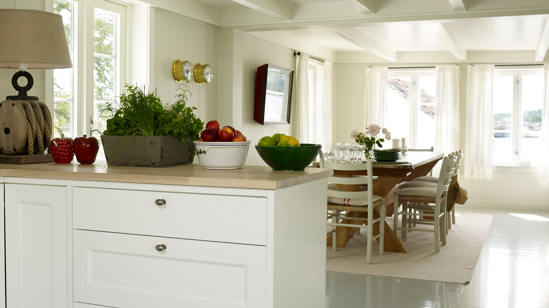 – Kjøkkenet er og blir det viktigste rommet for de fleste i dag, forteller Janicke Jebsen Vinje. På sommerstedet på Ågerøya har hun valgt en innredning som er holdt i en diskret, enkel stil som kler det gamle skipperhuset. Slik føles ikke husets indre fremmed mot det ytre, selv om det er over et århundre i aldersforskjell. Selve kjøkkenet er trukket inn i huset, hvor det har fått en egen inngang; utrolig praktisk på varme sommerdager når måltidene skal tas med ut i det fri. – Detaljene er spesielt fine i denne modellen som er inspirert av den amerikanske Shakerstilen – Et klassisk kjøkken, Blindleia fra Strai med sine markerte rammer, kler det gamle skipperhuset forklarer Jebsen Vinje.
