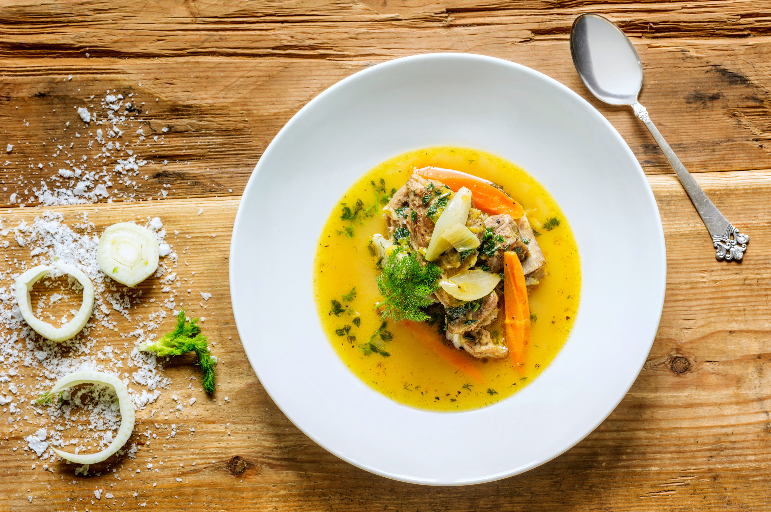 Rør inn olivenoljen. Skjær kjøttet i strimler når det er kaldt nok til å ta i. Fordel grønnsaksbuljong og grønnsaker i dype tallerkener.