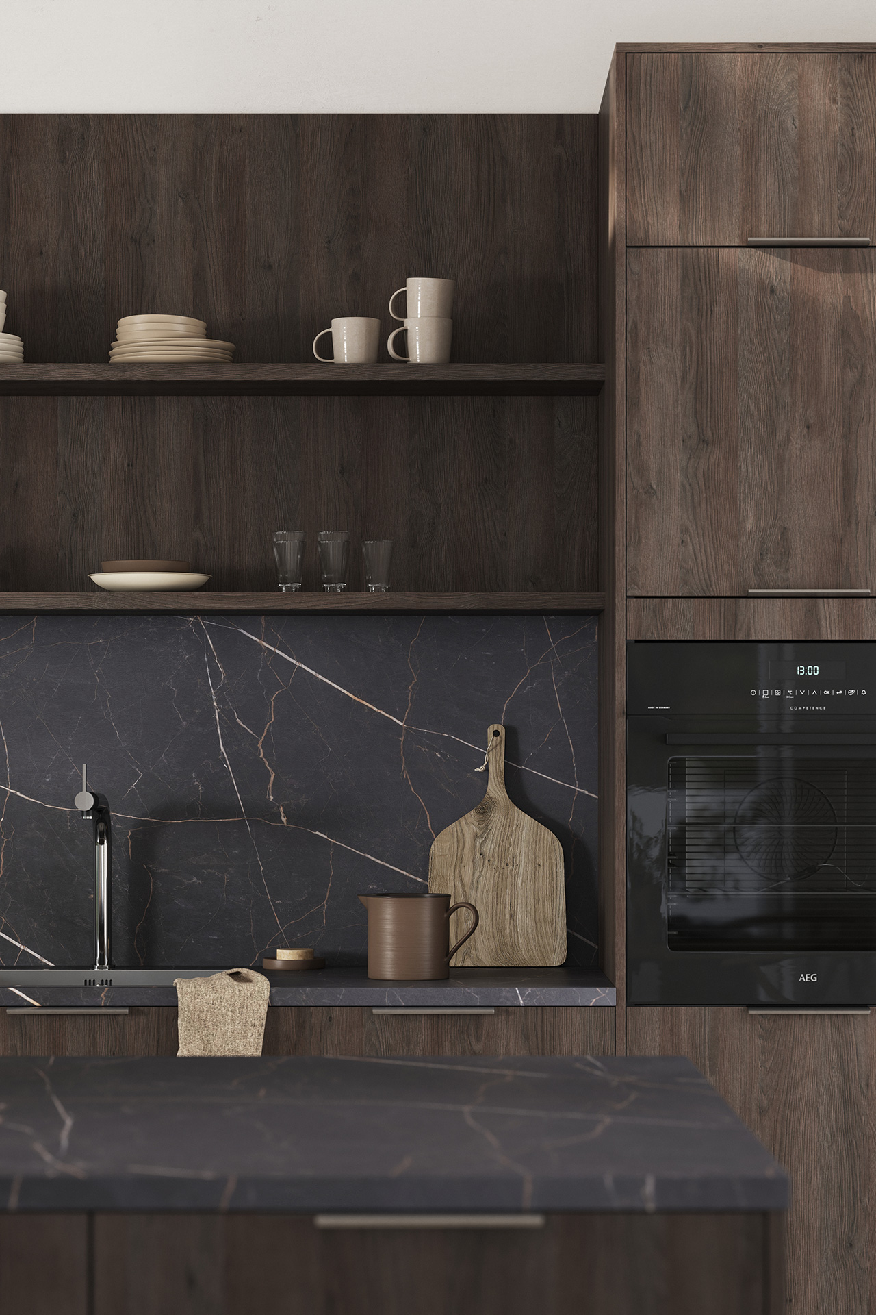 Denne modellen får du i fem ulike melaminfarger: Mørk Brun Eik Dekor, Sort Eik Dekor, Lys Eik Dekor og Natur Eik Dekor og Jord Eik Dekor.