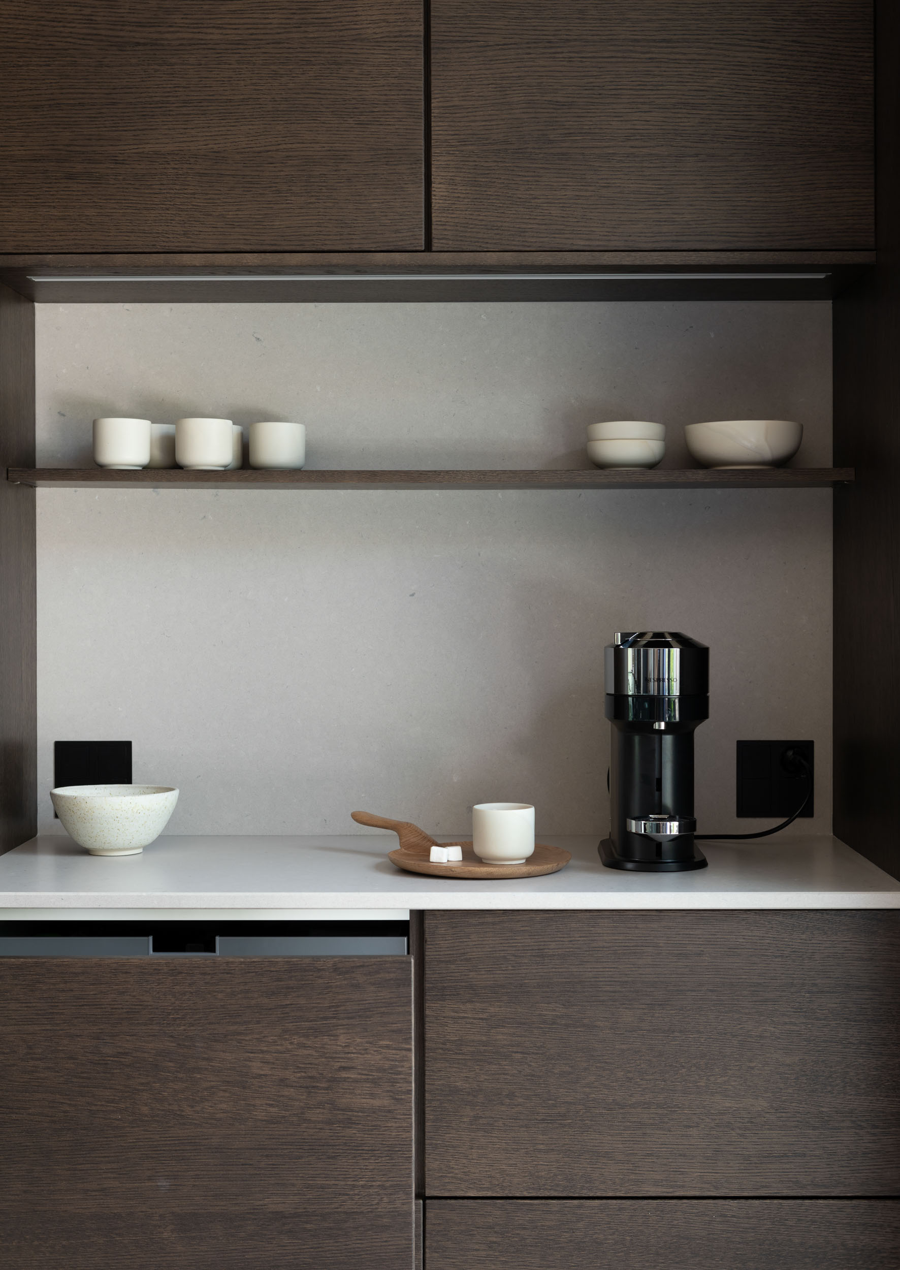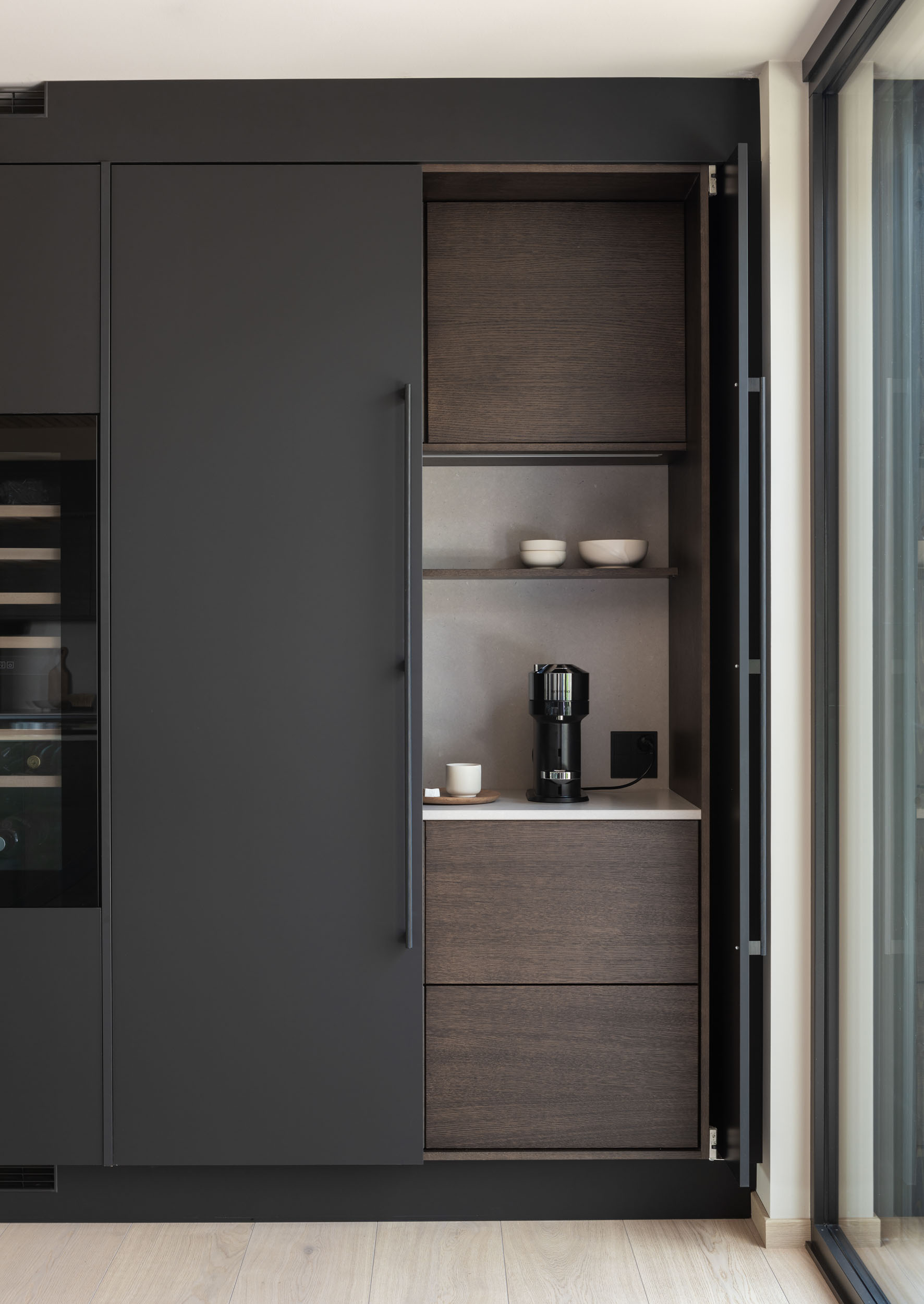 Ved å holde pocketdørene åpne får du både det praktiske og det estetiske uttrykket frem. Dørene blir skult inn i «lommene» i skapet og benkeplaten og den lekre innredningen kommer frem. Her kan du vise frem interiørfavorittene dine og lage en hyggelig kaffestasjon, bakeavdeling eller en liten barløsning – her er det bare å være kreativ og skape ditt eget personlige uttrykk.