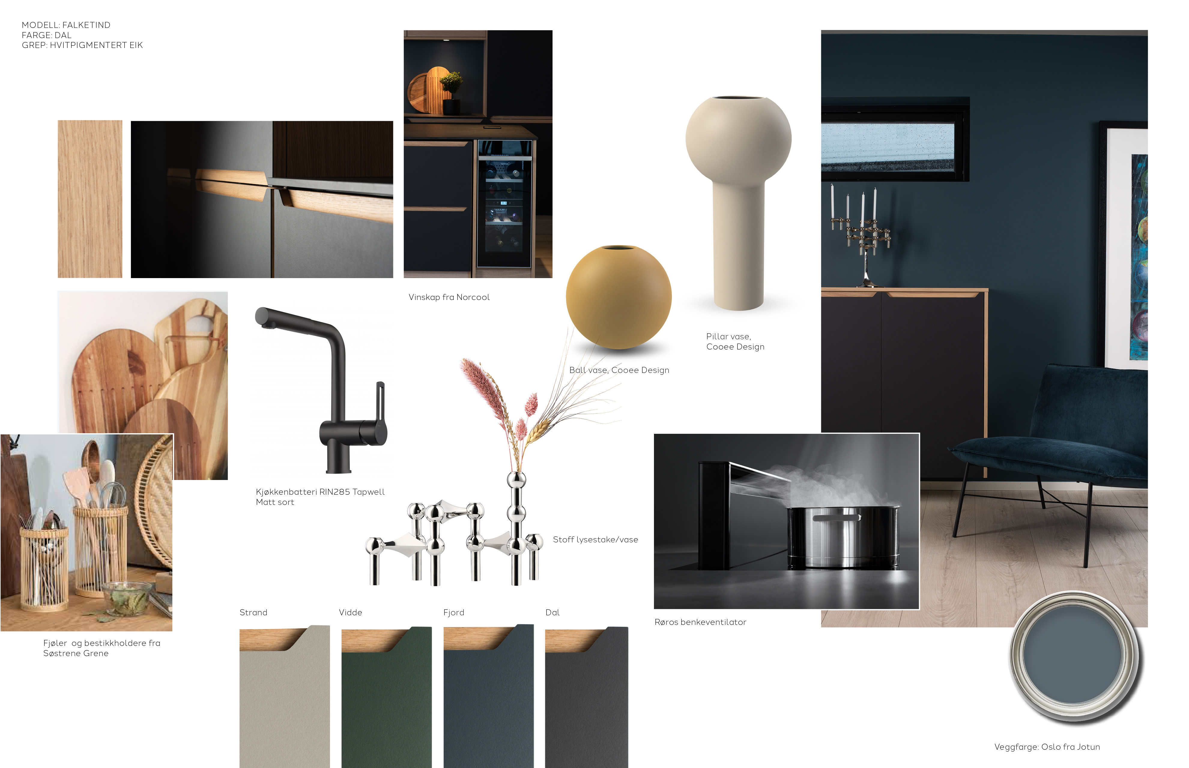 Et rent og varmt kjøkken i miljøvennlige materialer. Med fronter av naturproduktet linoleum, og lister i tre er Falketind en sofistikert og påkostet modell. Prikken over i’en er det lekre, integrerte grepet i massiv eik. Falketind er tilgjengelig i fire ulike farger, og detaljene i eik kan fås i natur og i hvit.