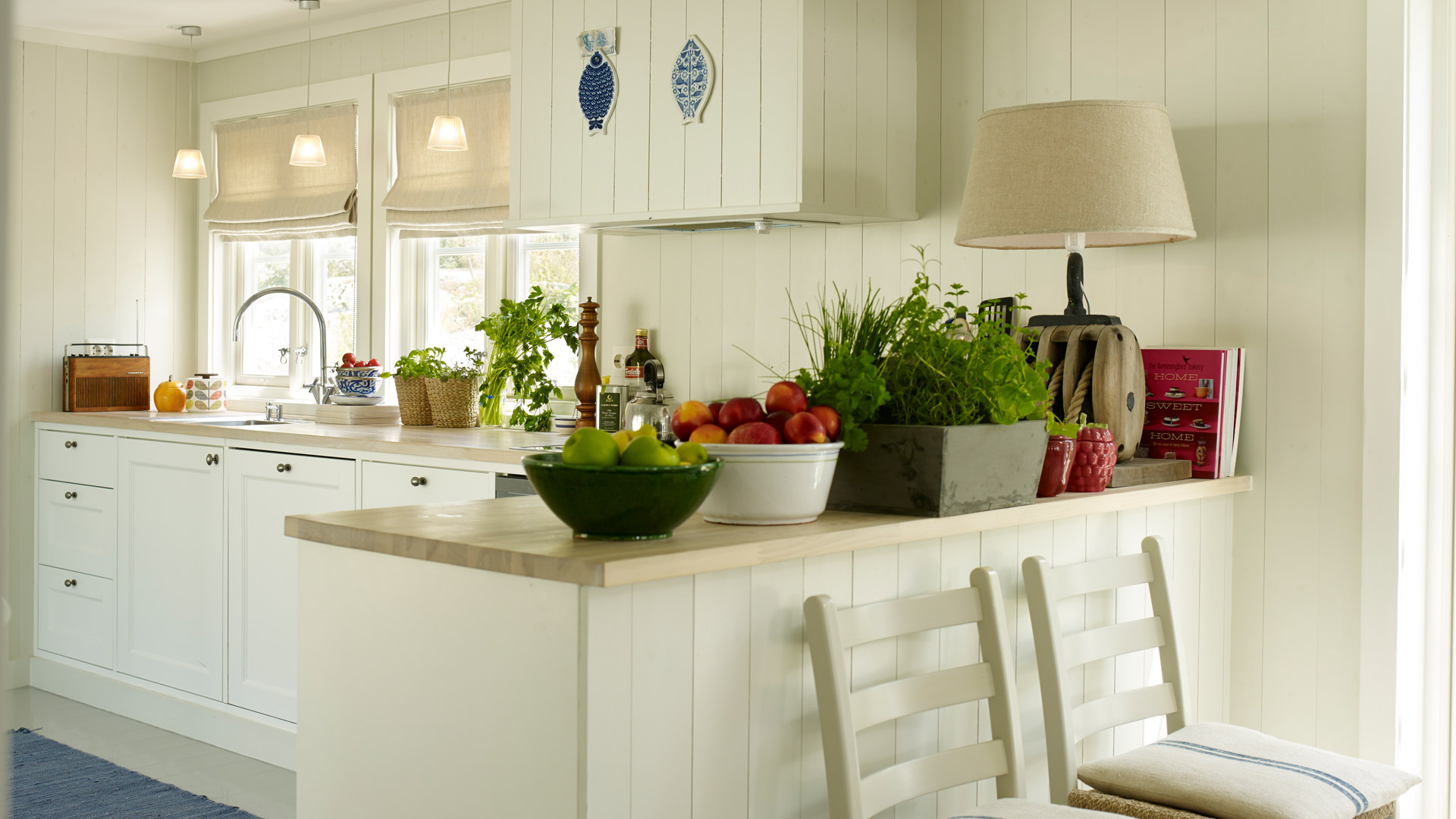 – Kjøkkenet er og blir det viktigste rommet for de fleste i dag, forteller Janicke Jebsen Vinje. På sommerstedet på Ågerøya har hun valgt en innredning som er holdt i en diskret, enkel stil som kler det gamle skipperhuset. Slik føles ikke husets indre fremmed mot det ytre, selv om det er over et århundre i aldersforskjell. Selve kjøkkenet er trukket inn i huset, hvor det har fått en egen inngang; utrolig praktisk på varme sommerdager når måltidene skal tas med ut i det fri. – Detaljene er spesielt fine i denne modellen som er inspirert av den amerikanske Shakerstilen – Et klassisk kjøkken, Blindleia fra Strai med sine markerte rammer, kler det gamle skipperhuset forklarer Jebsen Vinje.