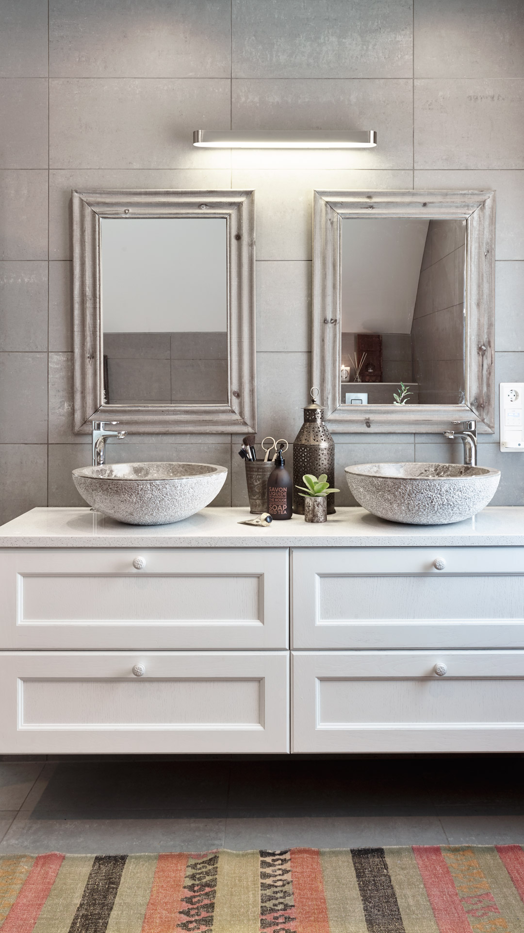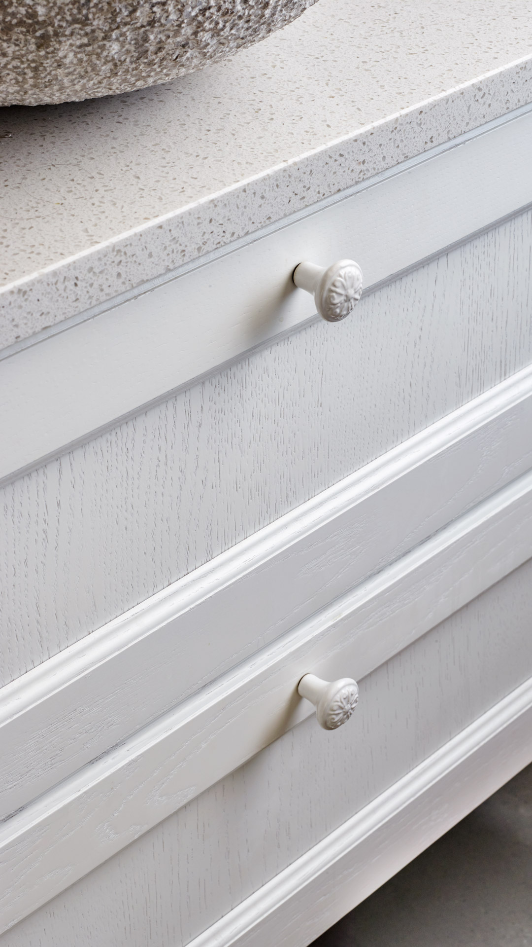 Kristin og Karl Erik valgte også baderomsinnredning fra Strai da de bygde om det ene soverommet til et bad. – På badet ønsket vi en lun stemning med vekt på ekte, naturlige materialer, og falt begge for kombinasjonen av fronter i heltre og en benkeplate i sten. På denne måten skaper trestrukturen i innredningen en spennende kontrast mot den solide benkeplaten. I tillegg valgte vi skuffer i alle skapene, noen som gjør det oversiktlig og enkelt å få tak i alt vi trenger, avslutter interiørentusiast Kristin Skaret.